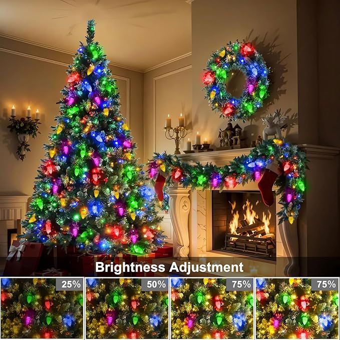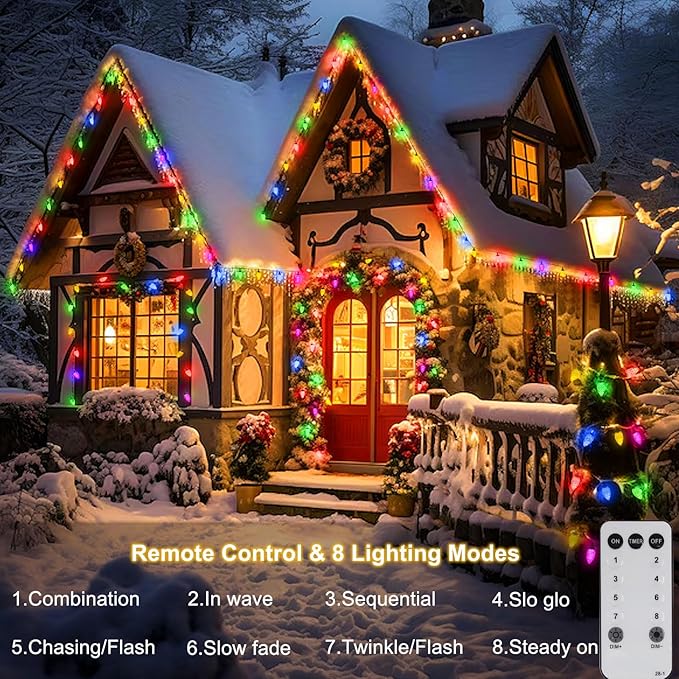 - C9 String Lights: Size: 66Ft 100 LEDs. Dark green wire C9 Christmas string lights. Distance between each lights: 7.8”. Suitable for Christmas House, Trees, Roofs, Walls, Houses, Yards, Fences decoration