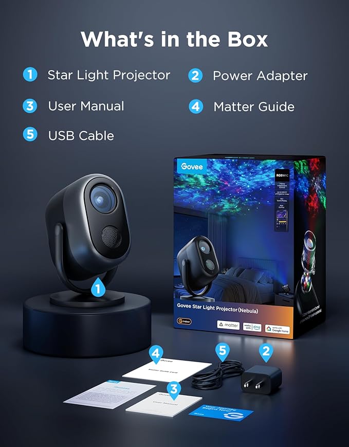 - Full DIY Control via Smart Command: DIY each zone’s color, brightness, speed, and motion—create flowing or breathing effects. Works with Matter, Alexa, and Google Assistant for hands-free control. Enjoy a starry sky with blink and orbit motions for a truly dynamic projection.