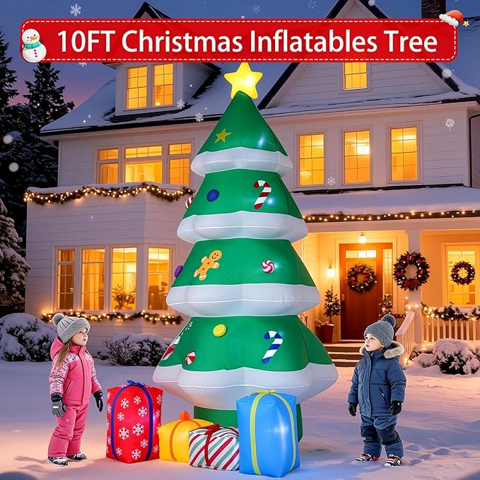 - 【10FT CHRISTMAS INFLATABLES】Our inflatable Christmas tree brings holiday cheer with its classic design, complete with a bright yellow star topper, festive candy cane and star patterns, and and other classic Christmas elements. Perfect for creating those merry christmas holiday memories with family and friends!